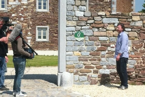 Christer Elfving voor de camera bij de ingang van vakantiehuis Chateauferme sur les Sarts Smaakvolle vakantiewoningen van Belvilla als decor…