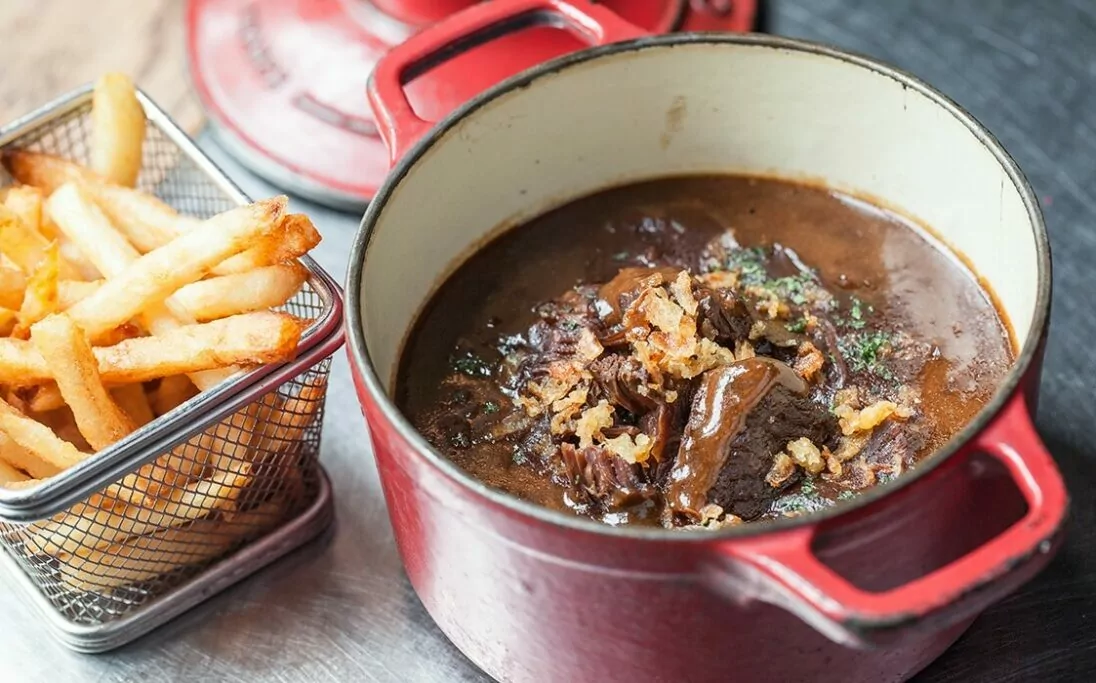 Ik ben in een niet eens zo ver verleden een dag in Gent op stap geweest met een bus Japanse toeristen. ’s Middags werden de gasten ten tafel gevraagd in een traditionele brasserie, van het soort waar stoofpotten eeuwig op het vuur lijken te pruttelen en bier in glazen van 33 cl wordt geschonken. Het hoofdgerecht was stoofvlees, of stoverij of ook nog stoofkarbonade, in een intens bruine biersaus. De lieve Japanners wisten niet waar zij het hadden. De stoverij is een variante op het bekende Franse gerecht boeuf bourguignon, waarbij de rode wijn vervangen wordt door donker bier, een boterham met mosterd voor binding zorgt en een zoete toets wordt toegevoegd aan de hand van peperkoek of een lepel appelstroop.