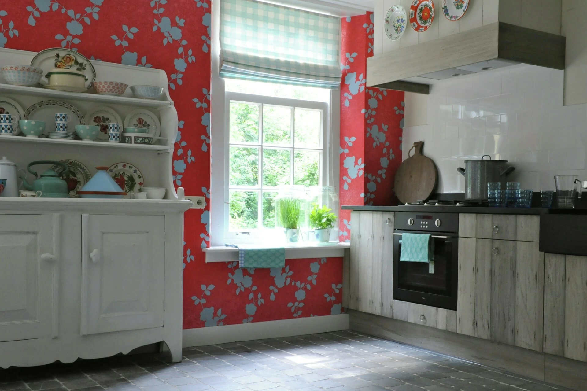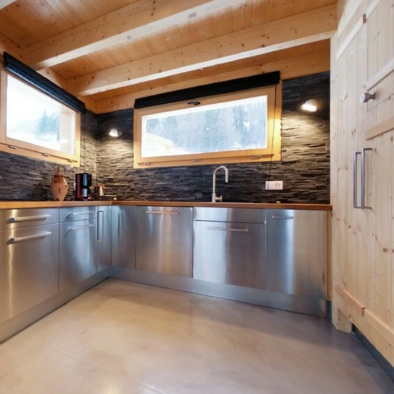 Een professionele ruime keuken en lange tafels zorgen voor voldoende ruimte in dit wintersportchalet