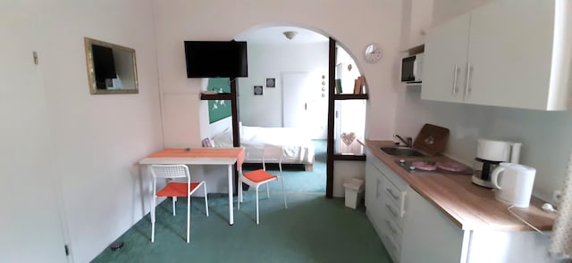 Binnen beschikt het appartement over een gezellige woonkamer met een eettafel, een zithoek en kabel-tv. De open keuken is uitgerust met een koffiezetapparaat, waterkoker, fornuis en koelkast – perfect voor het bereiden van eenvoudige maaltijden. Een comfortabele slaapkamer met een tweepersoonsbed en een eigen badkamer zorgt voor privacy en ontspanning. Centrale verwarming en parkeergelegenheid op het terrein dragen bij aan het gemak, waardoor het het hele jaar door een gezellig toevluchtsoord is.