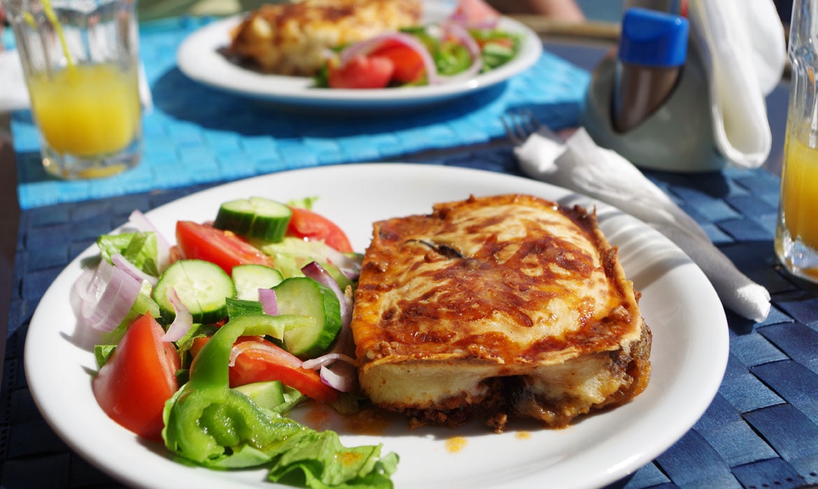 Na een aantal dagen gegrild vlees te hebben geproefd, werd het tijd om een keer iets anders te bestellen. Op de kaart zag ik moussaka staan, waar ik eigenlijk nog nooit van gehoord had. Na wat uitleg van de ober heb ik dit aubergine gerecht besteld. Het lijkt een beetje op lasagne, maar dan wordt het vooral gemaakt met aubergines, courgettes, gefrituurde aardappelen, gehakt, tomaat, kruiden en wijn. Tot slot wordt er bechamelsaus en kaas overheen gedaan. Dit gerecht is ook zeker een aanrader als je eens wat anders wilt proeven.