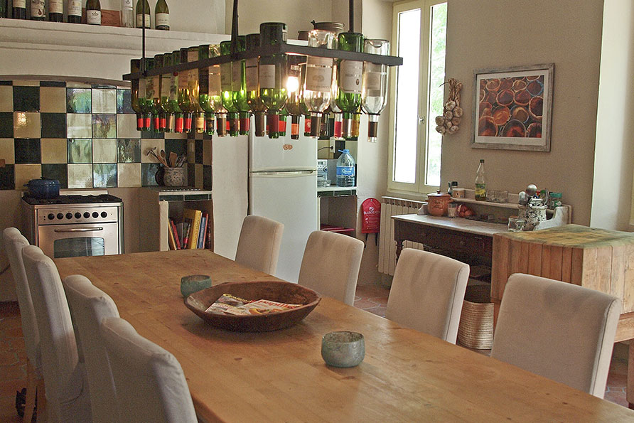 “Natuurlijk ontmoet ik veel verschillende huiseigenaren, meestal Nederlanders, Belgen en Fransen, soms ook Brits of Scandinavisch. Er zitten zelfs bekende Nederlanders en Vlamingen bij, maar ik ga je natuurlijk niet vertellen wie dat zijn”, lacht ze geheimzinnig. “Sommige eigenaren wonen permanent in Nederland en willen dat hun tweede huis minder leegstaat. Anderen gaan echt voor de opbrengst. Meestal ontstaat een leuk contact met ze en het draait dan ook vaak uit op samen tafelen met een goed glas wijn. Op een bijzonder wijngoed in Entrecasteaux in de Provence nam de eigenaar me bijvoorbeeld mee met zijn jeep door de wijngaarden. Heerlijke wijn trouwens! Hier zag ik mijzelf al zitten met vrienden aan tafel. Mooi ook hoe ze de link met wijn binnen hebben voortgezet met een heel originele lamp boven de eettafel!”