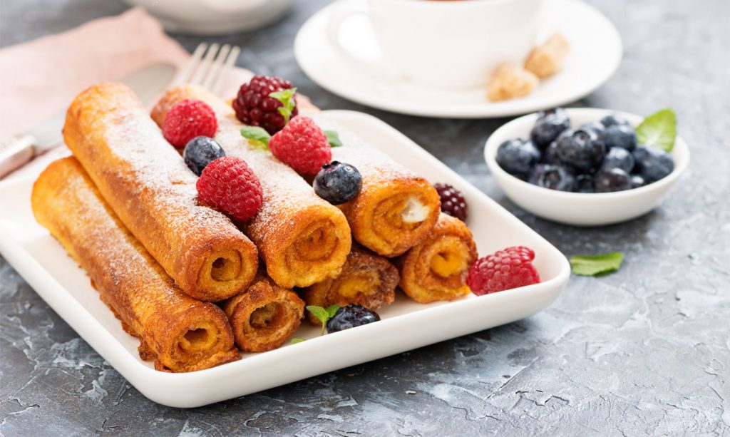 Snijd de korstjes van de sneetjes brood. Rol deze daarna iets plat met een deegroller. Smeer een reepje roomkaas op het brood en verdeel hier wat kleine stukjes aardbeien over. Rol het brood op en ‘plak’ vast met een beetje roomkaas. Klop de eieren los met de melk en kaneel. Haal de rolletjes brood hier door. Verhit wat boter of margarine in een pan en voeg de broodrolletjes toe. Draai ze regelmatig om. Als ze na een paar minuten mooi goudbruin zijn geworden zijn ze klaar. Meng de suiker met kaneel op een bord en rol hier de rolletjes doorheen. Serveer de wentelteefrolletjes met wat extra aardbeien of frambozen en blauwe besjes.