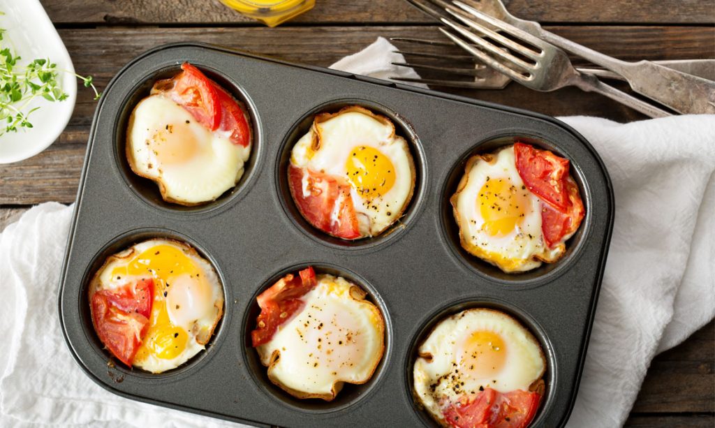Snijd de korstjes van de sneetjes brood af. Vet vervolgens de muffinvorm licht in met de boter of margarine en bekleed deze met het brood. Voeg daarna aan elk sneetje brood een plakje spek toe. Druk het geheel goed aan om ruimte te maken voor het ei.
