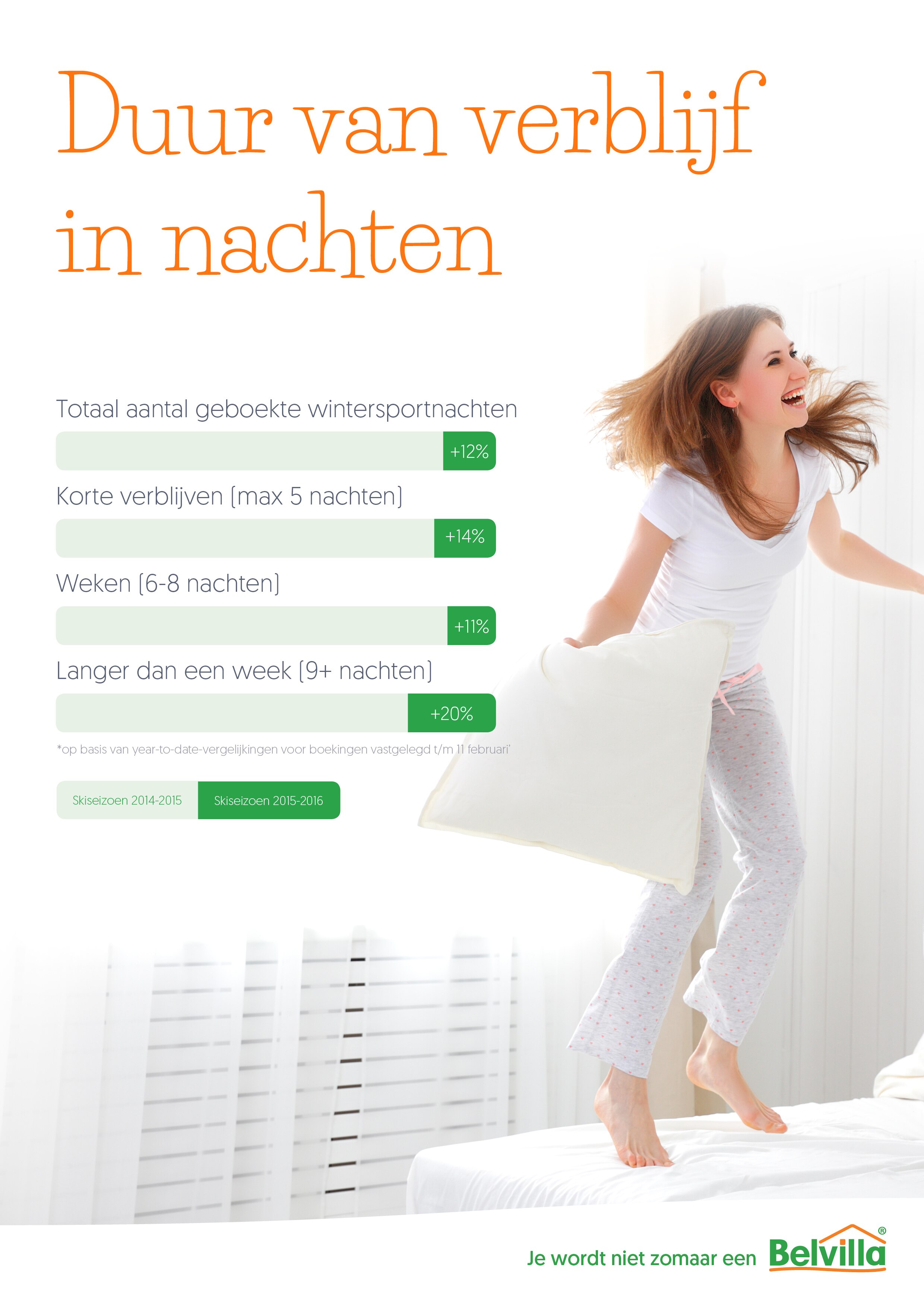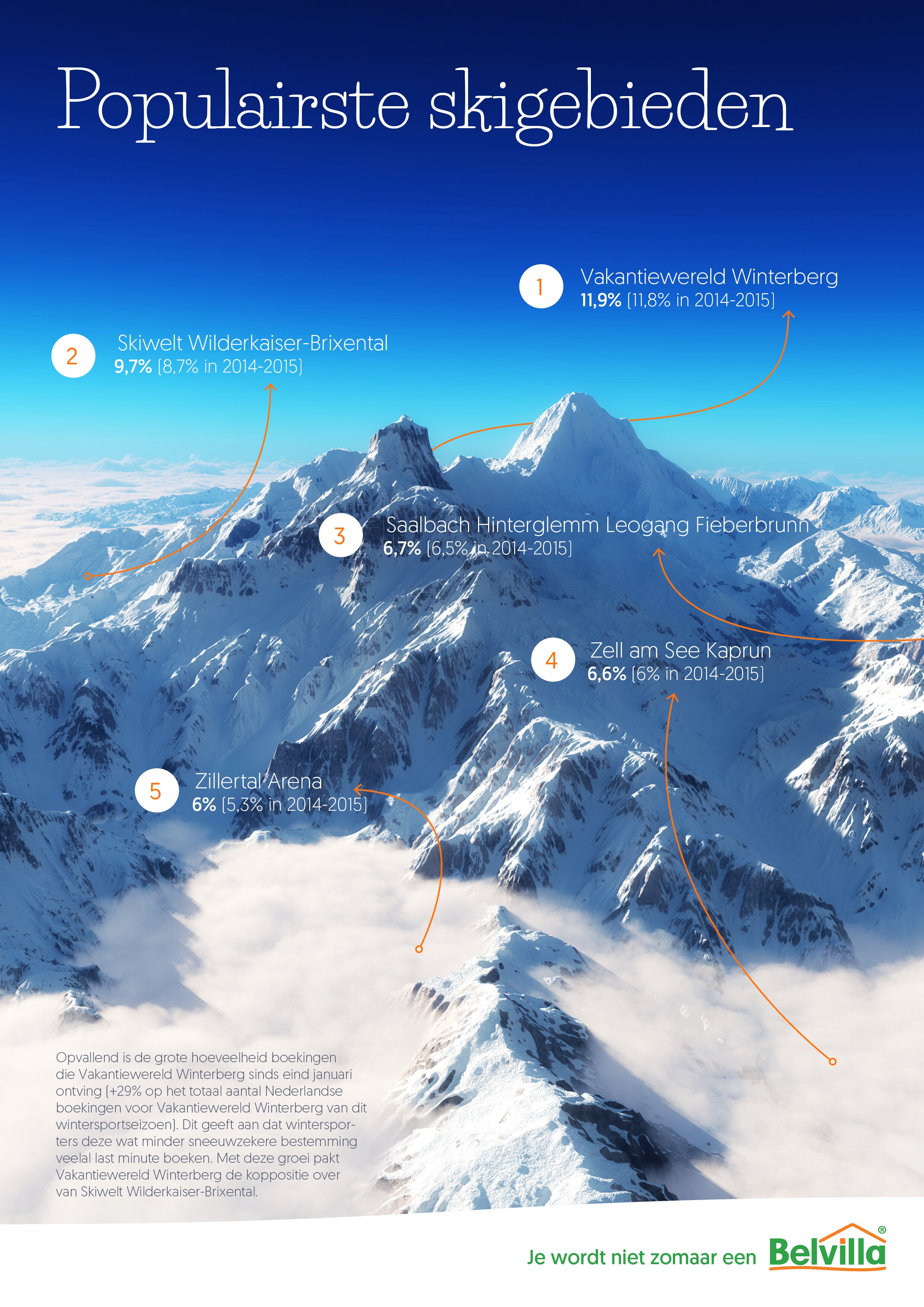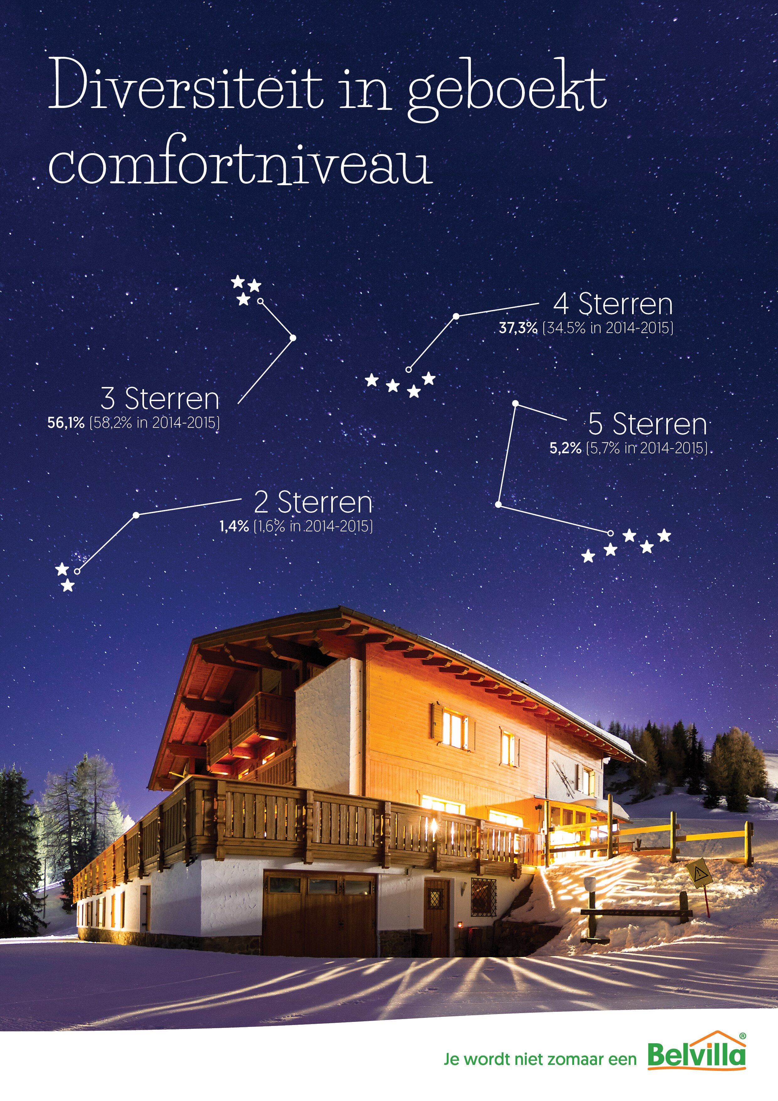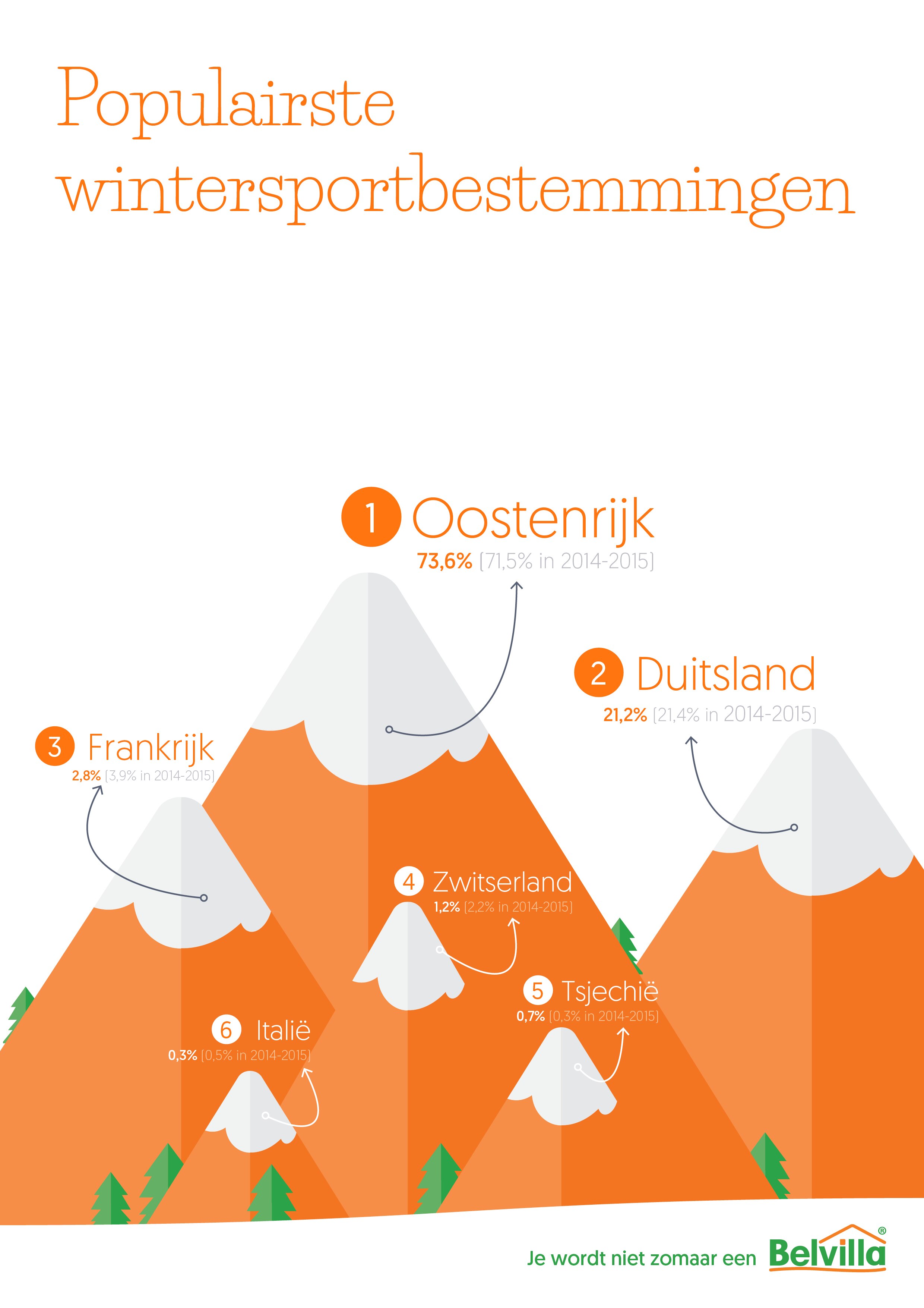 Het rapport is gebaseerd op Belvilla-boekingsdata van Nederlandse wintersporters en vergelijkt wintersportseizoen 2015-2016 met het wintersportseizoen van vorig jaar. Het volledige wintersporttrendrapport is te downloaden als PDF. Tevens bieden we iedere afbeelding hieronder los aan in hoge resolutie (klik op de afbeelding om te downloaden).