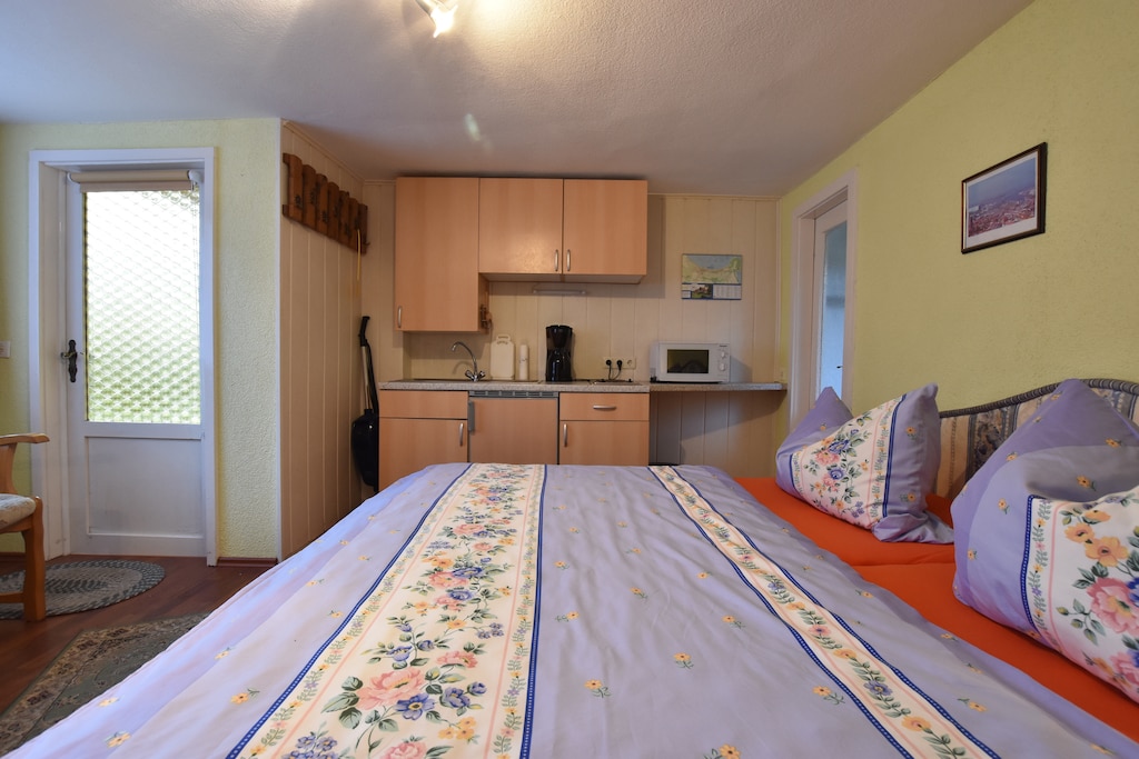 Das Zimmer ist etwas altmodisch, aber zweckmäßig eingerichtet. Bad ist in Ordnung, Küche recht gut sortiert. es ist insgesamt recht klein, aber total ok. kleine Terrasse vor der Tür, die direkt an die der Nachbarwohnung angrenzt. Netzempfang schlecht, eigentlich gar nicht, nur auf dem Parkplatz. Internet über Haus müsste verstärkt werden, so reicht es nicht mal für Mails oder Whats app. Sehr freundliche und hilfsbereite Gastgeber, großer Parkplatz. Es gibt kein eingezäuntes Areal für einen Hund.