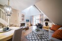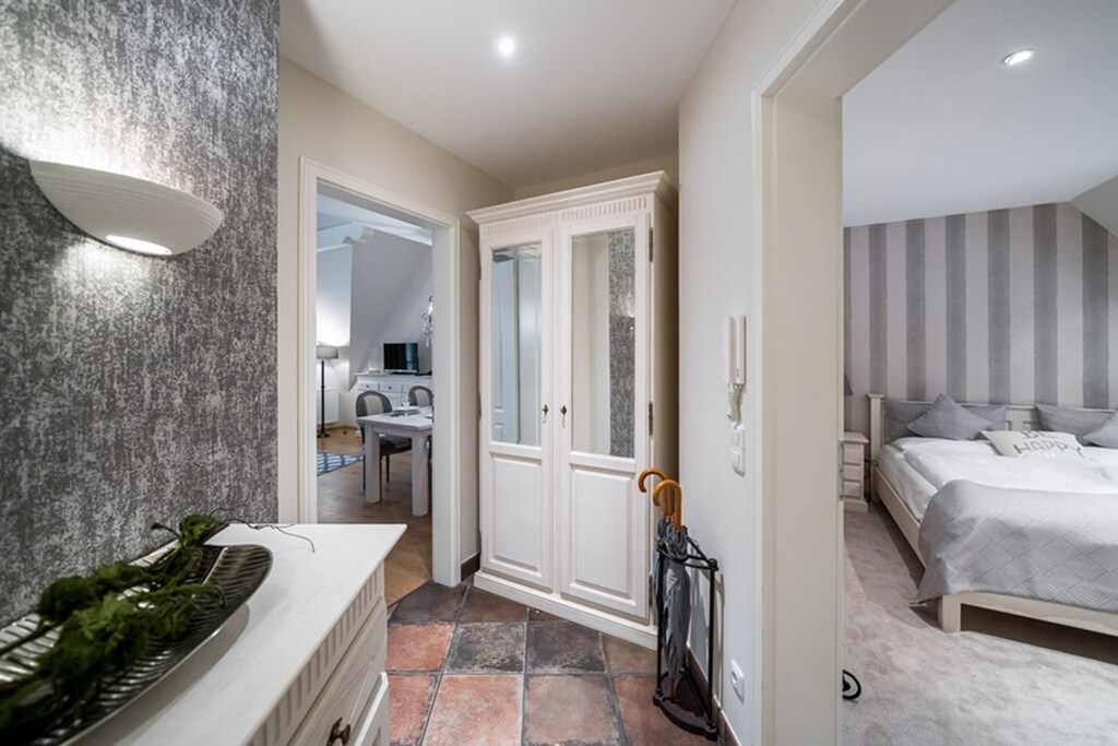 Een trap leidt naar de verbouwde zolder, waar zich nog een tweepersoonsslaapkamer en een eigen badkamer met douche bevinden – ideaal voor gezinnen of stellen die waarde hechten aan privacy. Het appartement beschikt tevens over een balkon en een privéparkeerplaats.
