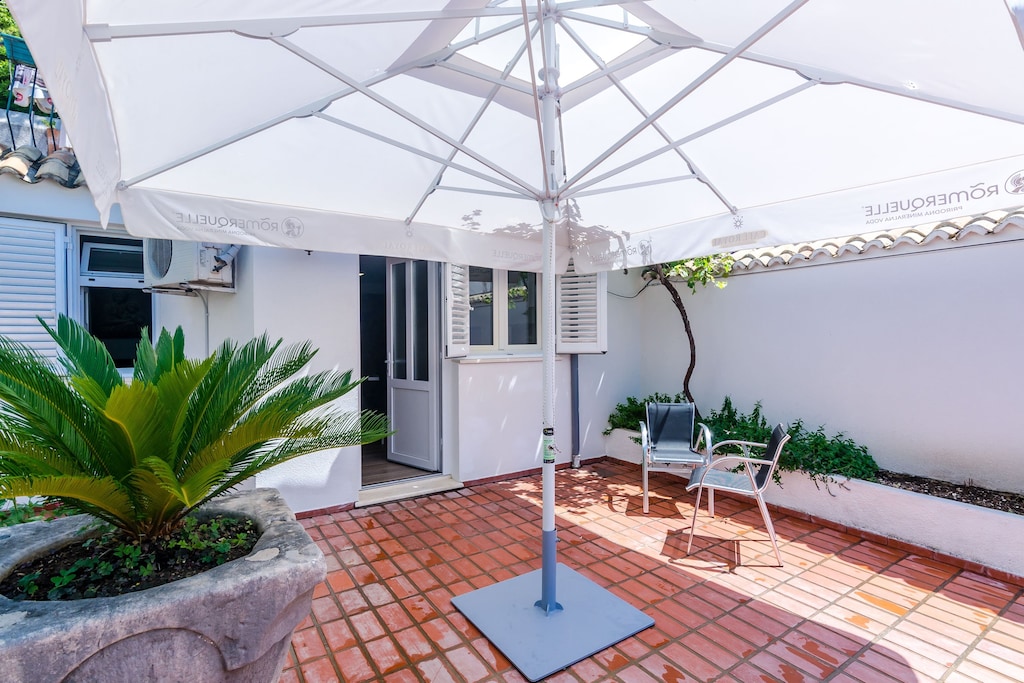 Shared terrace with an outdoor seating area and parasols is at guests' disposal.