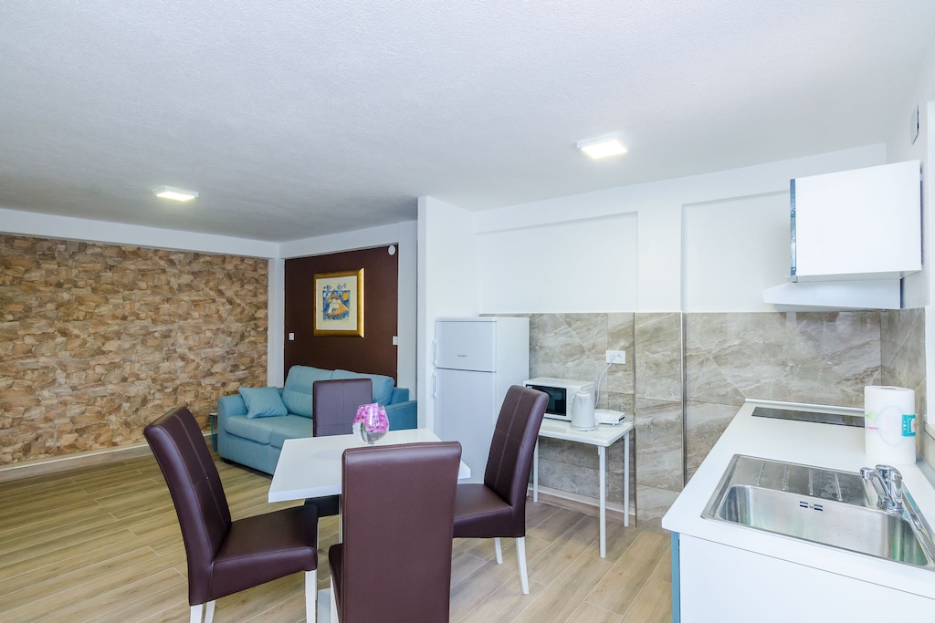 This one bedroom apartment with shared terrace features WiFi, air-conditioning, living room with cable TV, as well as kitchen fitted with a stove, refrigerator, water kettle, toaster, microwave and dining table. Bathroom is equipped with shower cabin, washing machine and hair dryer.