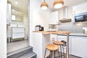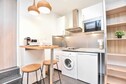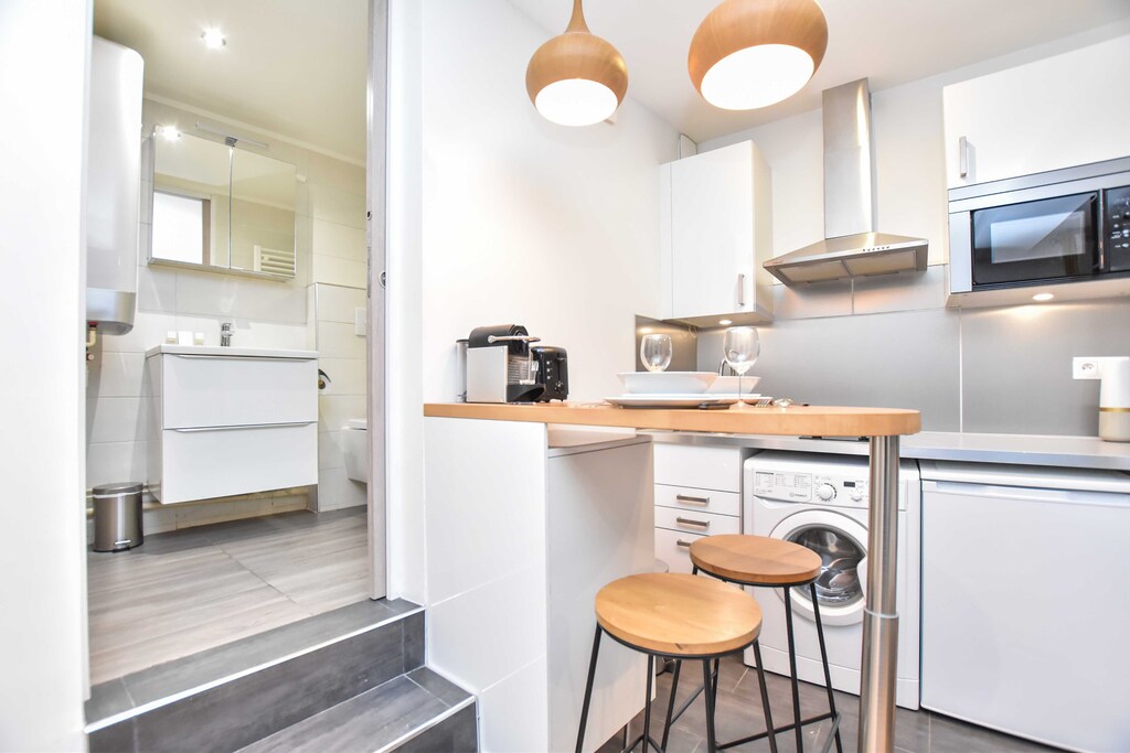 A superb apartment tastefully decorated in a quiet street and really close to the metro, Excellent location, you can walk to lively streets with bars and shops in a few minutes, Clean overall, comfortable bedding, very good quality bath linens, the towel warmer is a plus and really hot, Some furniture is different like the shelf or the small chest but not really important, The only small downside: you can hear the neighbors' toilet flush and also when they pass by our door, We had an excellent stay, Good communication with the agency,