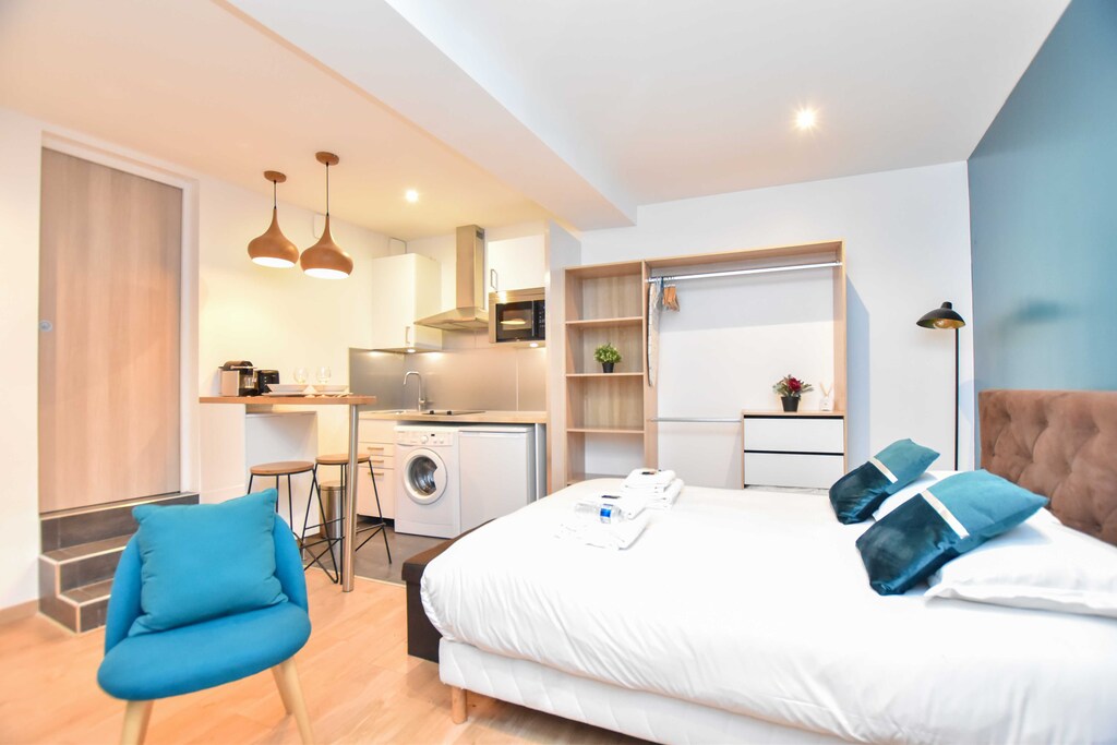 Le studio est vraiment bien situé, en plein centre et à proximité du métro, Très confortable et très propre, Arrivée autonome et contact facile et efficace avec le responsable, Seul inconvénient pour le lit d'appoint qui n'est vraiment pas confortable, sans matelas et instable, Dommage car sinon, c'était vraiment parfait, En résumé, si vous êtes 2 alors n'hésitez pas !😉