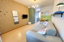 Bij binnenkomst vindt u een uitnodigende hal met een comfortabele slaapbank voor twee personen. Er is een televisie en een eettafel voor uw gemak. De open keuken is volledig uitgerust met moderne voorzieningen, zodat u met gemak heerlijke maaltijden en snacks kunt bereiden.