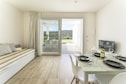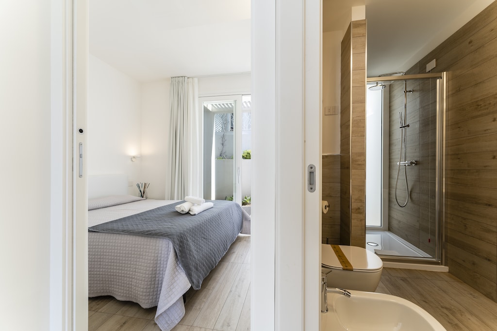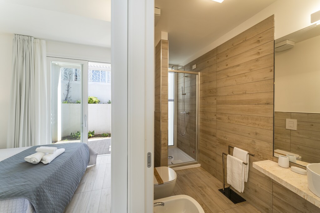 In sommige appartementen bevindt de badkamer zich in de slaapkamer met het tweepersoonsbed.