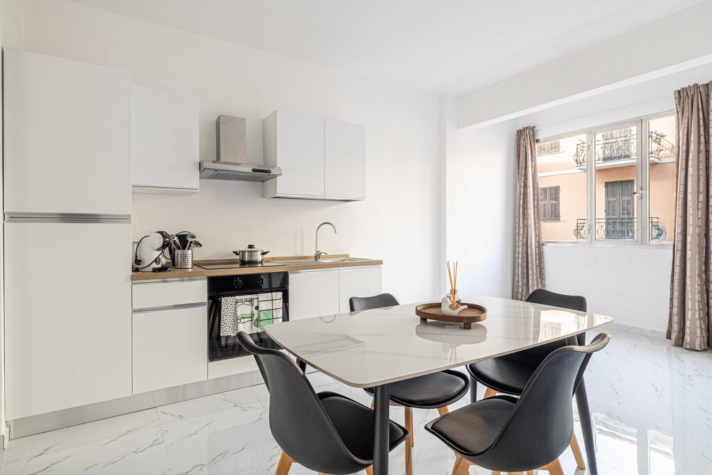 Eettafel, Kookplaat, Waterkoker, Broodrooster, Afzuigkap, Koffiezetapparaat, Magnetron, Koelkast, Wastafel, Coffee, Wine glasses
