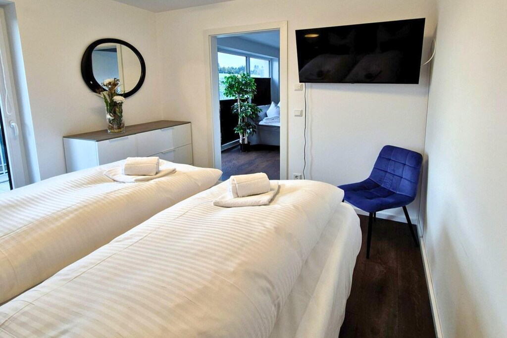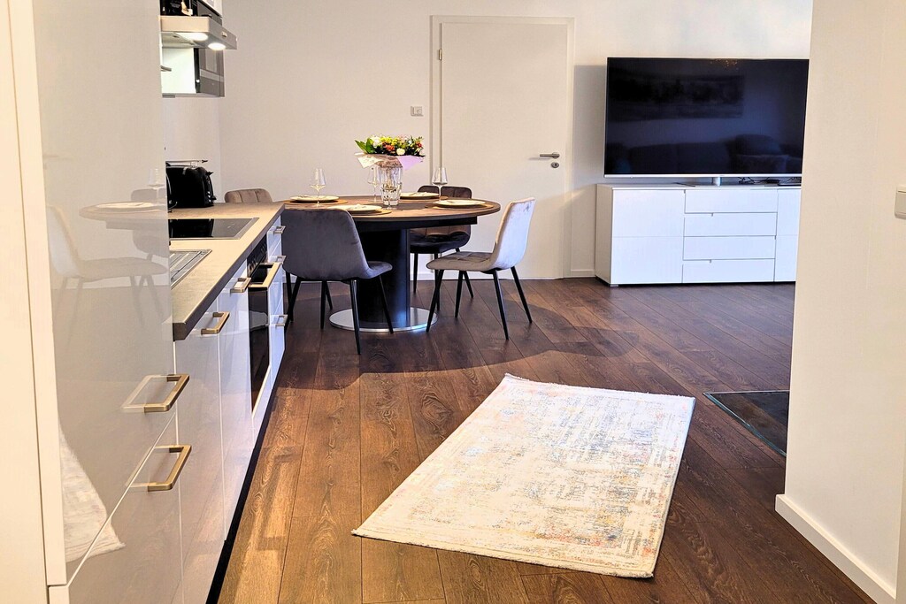 In totaal beschikt het appartement over een woonoppervlakte van circa 90 m², verdeeld over een hal, een grote woonkamer met een open, perfect uitgeruste keuken en een grote eettafel, twee smaakvol ingerichte slaapkamers met elk een ladekast, tweepersoonsbed en televisie, en een ruime badkamer, waarin zich naast een wasmachine ook een infraroodcabine voor 2 personen bevindt. Zowel vanuit de woonkamer als vanuit één van de slaapkamers heeft u toegang tot het grote balkon, dat is voorzien van een barbecue en (buiten het winterseizoen) tuinmeubilair. Voor een 5e persoon is er een slaapbank in de woonkamer.