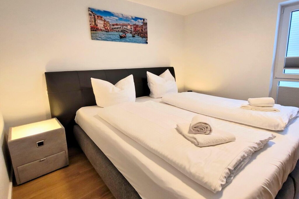 Het appartement beschikt over een gezellige woonkamer met een tweepersoonsslaapbank, tv en een eethoek, ideaal voor gezamenlijke maaltijden of spelletjesavonden. Een strakke, volledig uitgeruste keuken is voorzien van alles wat u nodig heeft - koffiezetapparaat, broodrooster, oven, magnetron, vaatwasser en meer - waardoor u moeiteloos zelf maaltijden kunt bereiden. Twee goed ingerichte slaapkamers zorgen voor een rustgevende nachtrust, elk met een tweepersoonsbed en tv. Eén kamer heeft ook een tweepersoonshoogslaper, perfect voor kinderen of extra gasten.