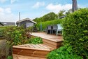 Die große eingezäunte Terrasse und die gut ausgestattete Küche,