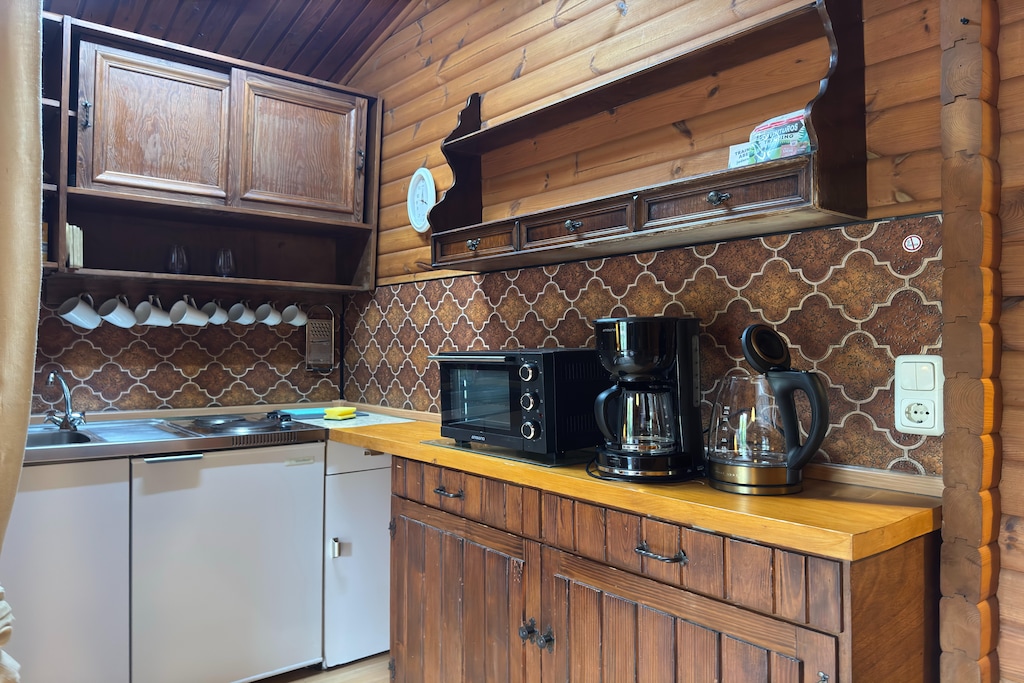 De badkamer is voorzien van een douche, toilet en wastafel, en centrale verwarming zorgt voor comfort het hele jaar door. Buiten kunnen gasten genieten van een privéterras en toegang tot een gemeenschappelijke tuin met tuinmeubilair, ligstoelen, een houtskoolbarbecue, een zandbak en speeltoestellen. Tegen betaling zijn er fietsen te huur op het terrein, ideaal om de nabijgelegen bospaden en de schilderachtige omgeving te verkennen.