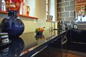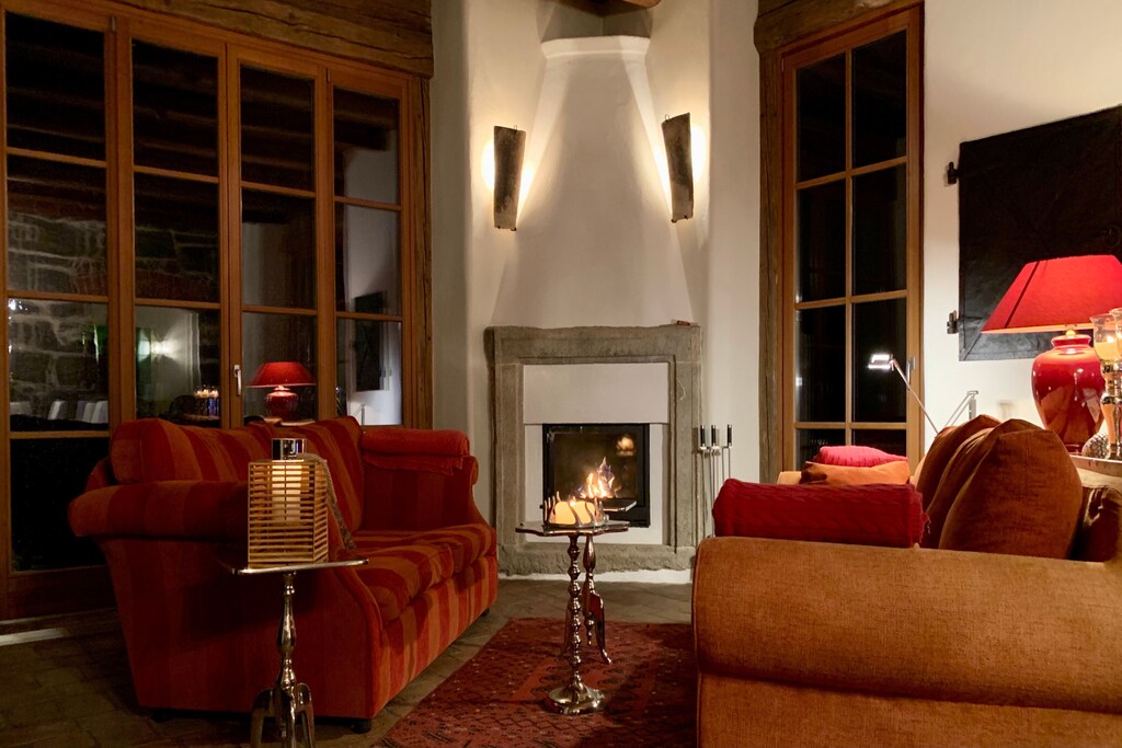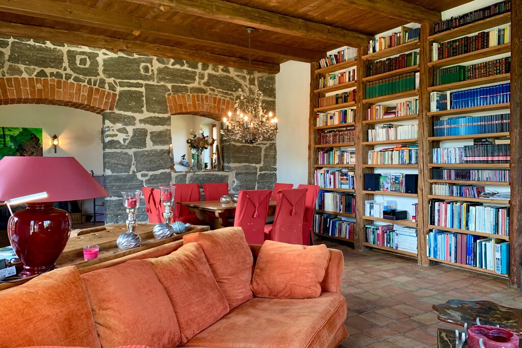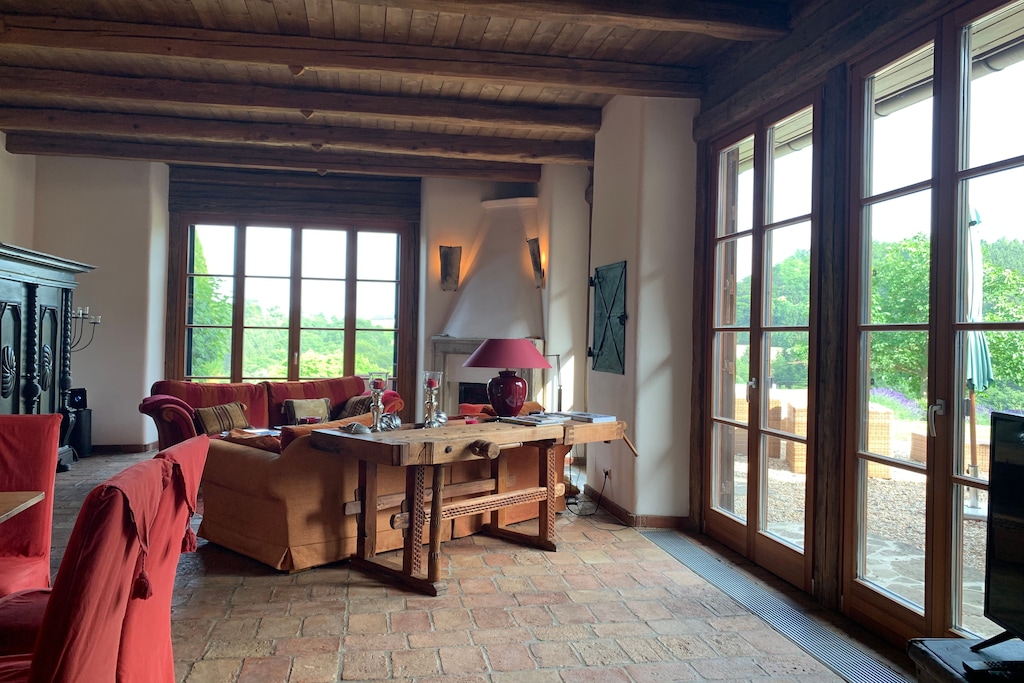 Het 250 jaar oude hoofdhuis op de begane grond (175 m²) is uitgebreid gerevitaliseerd. De oude charme bleef behouden en liefdevol ingericht met moderne technologie en voortreffelijk antiek. Twee slaapkamers met en-suite badkamers (waarvan één open, elk met ligbad, douche, toilet, haardroger, badjassen) bieden comfortabel plaats aan 4 personen. De ruime woonkamer met open haard (satelliet-tv, muziekinstallatie, bibliotheek) is aan twee kanten open naar het terras en de tuin. Openlijk grenst de keuken met complete uitrusting en een bijkeuken (wasmachine en wasdroger). Verder de entree en een gastentoilet.