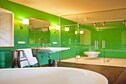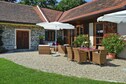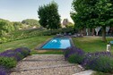 De gezellige tuin met het zwembad (9 x 3 m, biologische zoutreiniging) en het zonneterras verbindt de twee gebouwen en zorgt voor een ontspannen sfeer.
