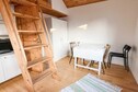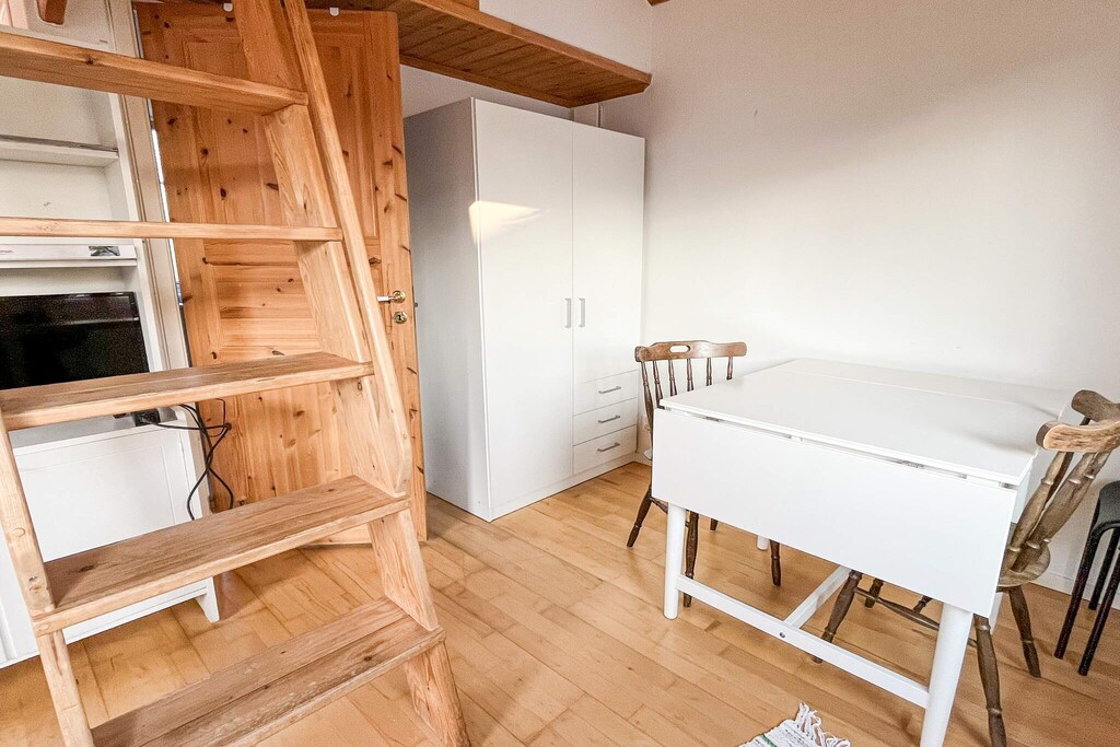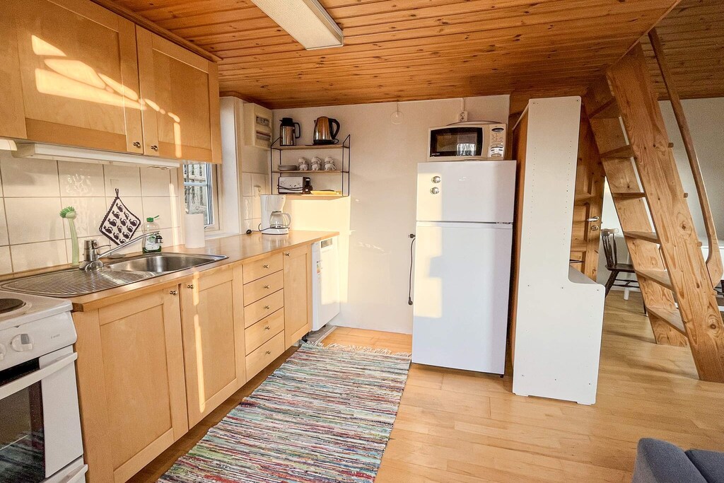 De stuga is luchtig met een gezellig loft met elk een eenpersoonsbed. Als u wilt, kunt u deze eenvoudig samenvoegen tot een knus tweepersoonsbed. Een grote badkamer met toilet, wastafel en douche. Een compleet keuken gecombineerd met een woonkamer met slaapbank. Een kleine eethoek voor vier en een kleine kast.