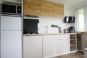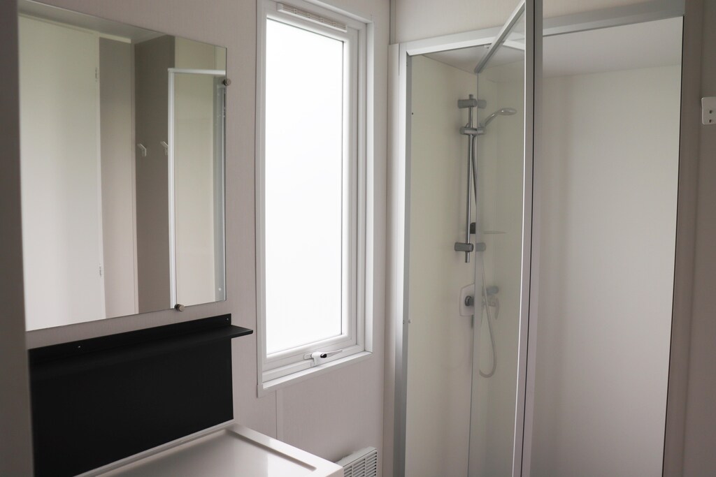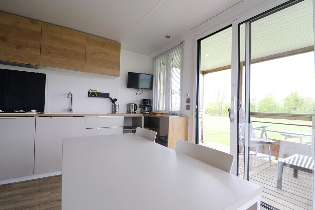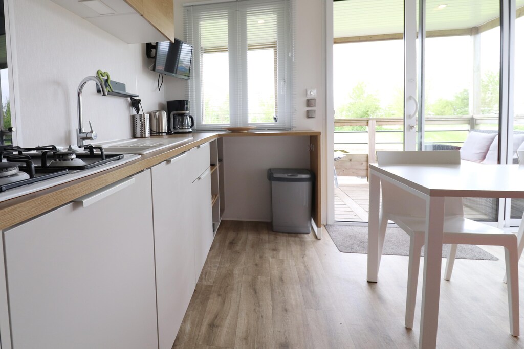 Binnen is het chalet volledig uitgerust voor comfort en functionaliteit. De keuken is voorzien van alle benodigdheden voor het bereiden van maaltijden en de woonkamer heeft een televisie voor entertainment. Zowel de woonkamer als de badkamer zijn voorzien van elektrische verwarming, wat zorgt voor een gezellige sfeer, zelfs op koelere dagen. De ramen zijn voorzien van horren en verduisterende rolgordijnen, zodat u ongestoord kunt genieten van rustgevende nachten en een frisse bries.