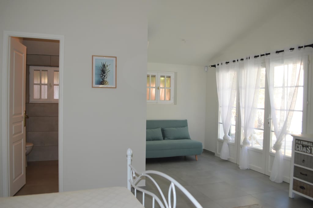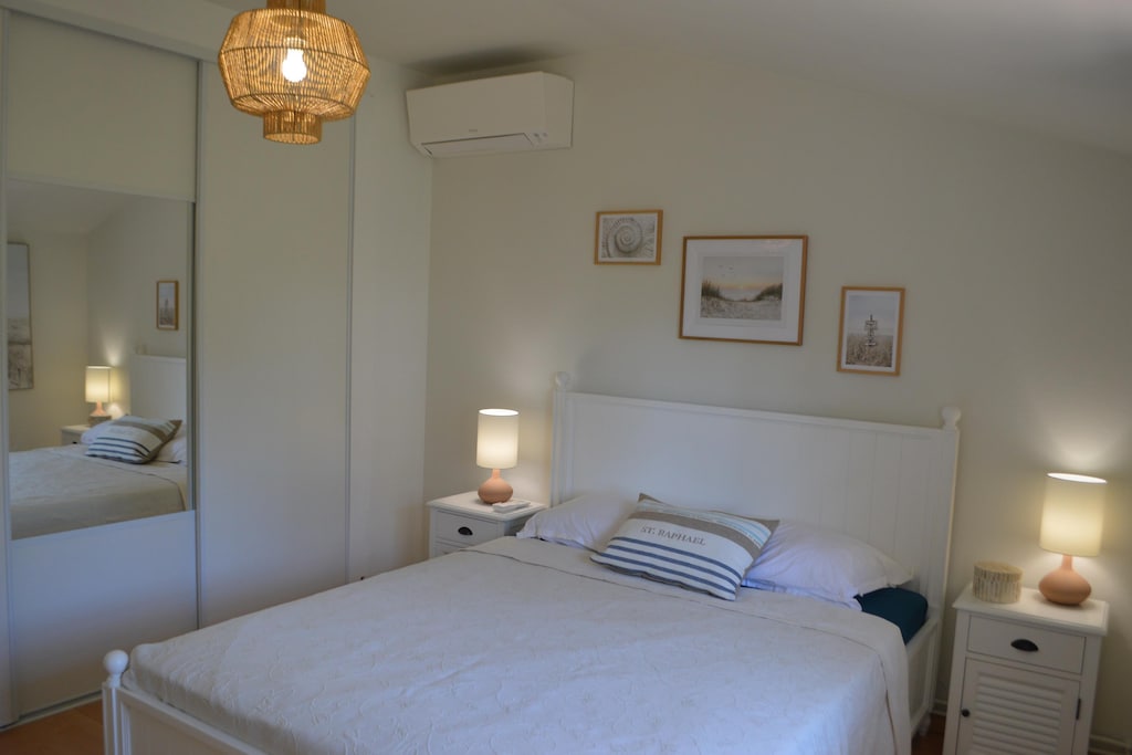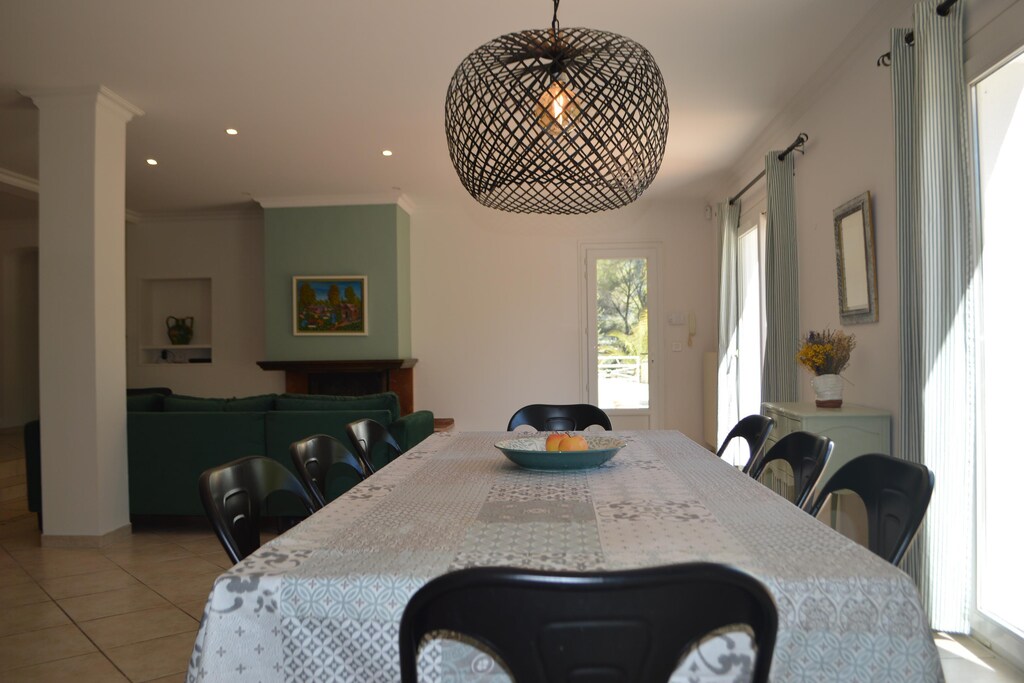 Via de schuifpui komt u direct in de woonkamer: een grote open ruimte met gezellige zithoek en open haard. Er is gekozen voor een moderne keuken met een eettafel, veel opbergruimte en een lang keukenblad. De hoofdslaapkamer biedt toegang tot het terras en zwembad en heeft veel lichtinval. De andere slaapkamers bevinden zich op de bovenverdieping en zijn voorzien van veel comfort. Alle slaapkamers zijn voorzien van airconditioning.