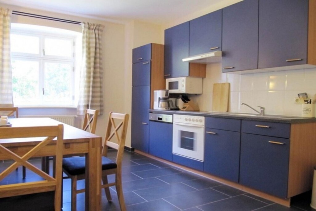 Eettafel, Kookplaat (keramisch), Broodrooster, Koffiezetapparaat, Oven, Magnetron, Afwasmachine, Koelkast (+ vriesvak)