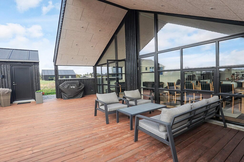 Ferienhaus in einem neu angelegten Ferienhausgebiet, am Ende einer Straße mit freiem Ausblick. Das Haus bietet Platz für die ganze Familie – sowohl drinnen mit gemütlichen Ecken als auch draußen auf der großen Holzterrasse. Das Ferienhaus ist 125 m² groß und wurde 2024 gebaut. Das Mitbringen von bis zu 2 Haustieren ist erlaubt. Das Ferienhaus ist mit einer energiefreundlichen Luft-Wasser-Wärmepumpe ausgestattet. Das gesamte Ferienhaus verfügt über angenehme Fußbodenheizung. Außerdem stehen Waschmaschine, Wäschetrockner sowie 80 Liter Gefrierkapazität bereit. Das Ferienhaus steht auf einem gut 2.000 m² großen Naturgrundstück. Zum Meer sind es etwa 1200 m. Das nächste Geschäft befindet sich in einer Entfernung von 1 km.Zum Ferienhaus gehört ein offener Terrassenbereich. Es gibt auch eine überdachte Terrasse. Parkplatz beim Ferienhaus. Im Haus gibt es insgesamt 3 Schlafzimmer. Die Schlafgelegenheiten teilen sich auf in: 6 Schlafgelegenheiten in Doppelbetten. Außerdem 2 Schlafplätze auf Matratzen. 2 dieser Schlafplätze befinden sich oben auf dem Dachboden des Hauses. Die Küche ist mit Kühlschrank, Induktionskochfeld, Heißluftofen, Mikrowelle und einer Spülmaschine gut ausgestattet. Es gibt zwei Badezimmer mit Duschen und Toilette sowie Fußbodenheizung. Entspannung ist in der Sauna möglich. Außerdem steht sowohl im Innen- als auch im Außenbereich ein Whirlpool zur Verfügung. Das Ferienhaus verfügt über 2 Fernseher, Chromecast. 1–3 deutsche Sender und WLAN ist verfügbar. Keine Vermietung an Jugendgruppen erwünscht.A refundable deposit might be charged closer to your check-in date. The security deposit ensures a smooth stay and covers any additional services or consumption charges.This deposit covers utilities consumed during your stay and any additional services that may be taken.The final amount will be adjusted based on actual meter readings, actual usage of extra services, and any remaining balance will be refunded within 21 days after checkout.This deposit simply acts as a prepayment for charges that you would anyways pay for, ensuring a seamless stay and check-out experience.