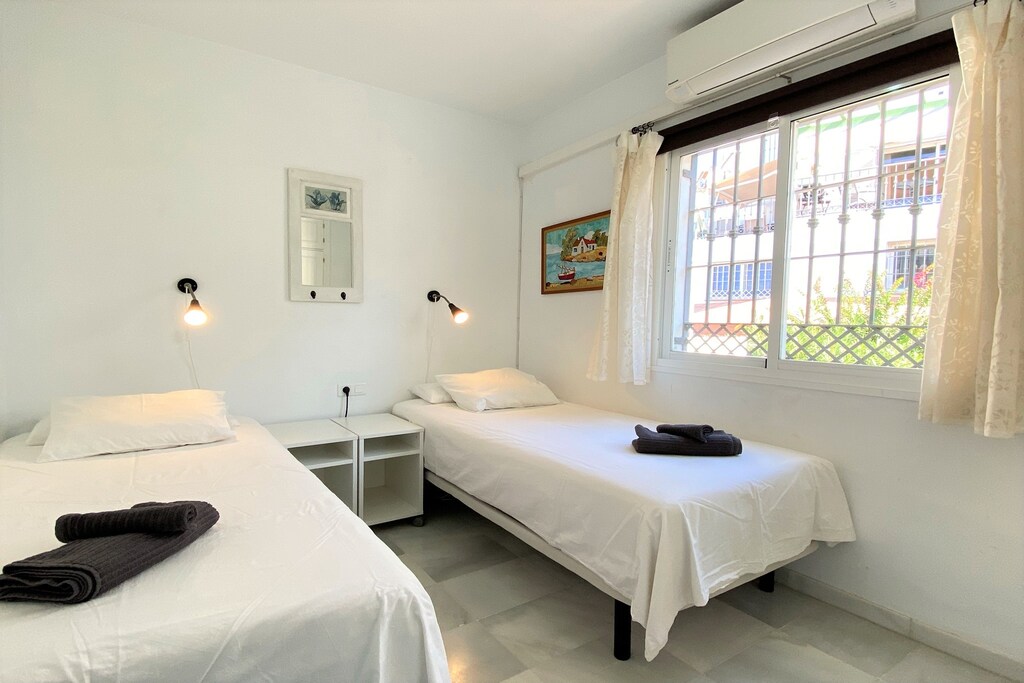 Dit moderne herenhuis met een frisse en comfortabele sfeer is ideaal voor maximaal vier gasten. Het beschikt over een ruime woonkamer met een bank, een eethoek en toegang tot snel glasvezelinternet en internationale tv-zenders. Beide slaapkamers zijn voorzien van flexibele bedindelingen, met keuze uit een- of tweepersoonsbedopstellingen. De woning beschikt ook over een privé dakterras, een kleiner terras op de begane grond en toegang tot een groot gemeenschappelijk zwembad dat gedeeld wordt door slechts 27 woningen in een rustig complex in Spaanse stijl. Huisdieren zijn niet toegestaan en het huis biedt een persoonlijke check-in voor een soepele aankomst.