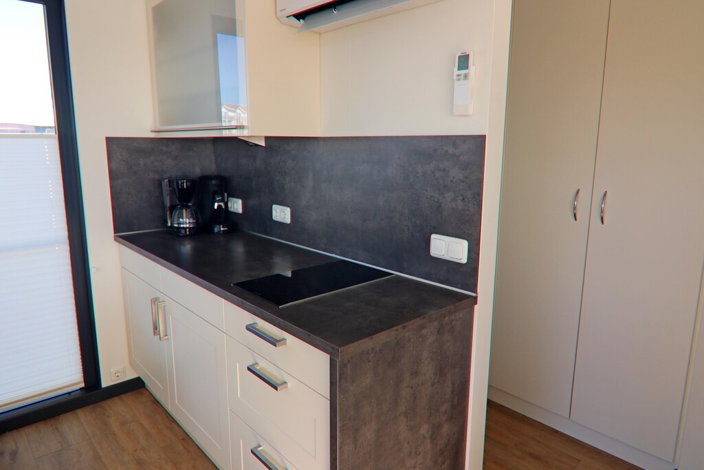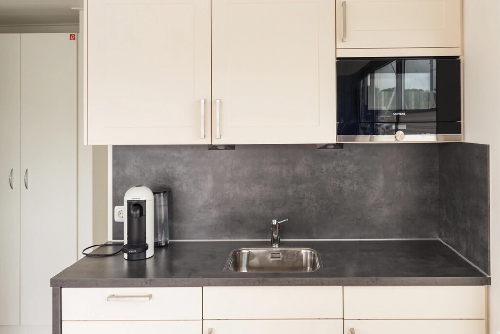 Kookplaat (2 kookplaten, keramisch), Waterkoker, Broodrooster, Koffiezetapparaat, Magnetron, Afwasmachine, Koelkast