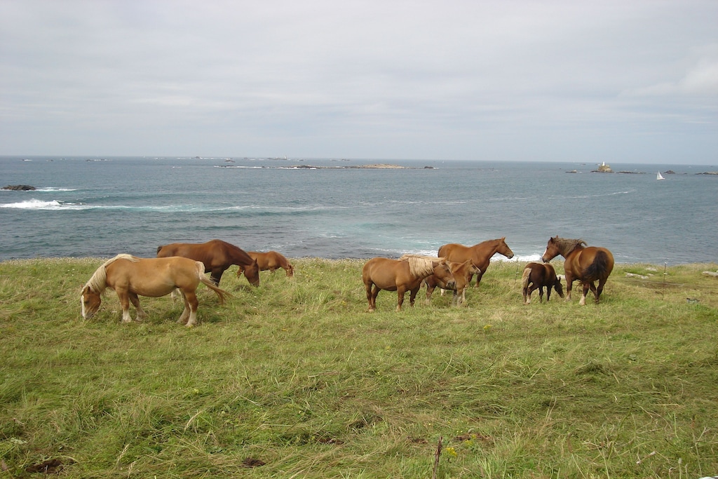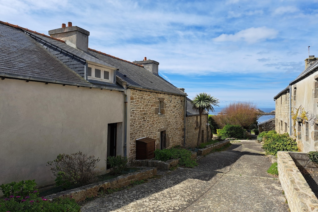 Deze typisch Bretonse halfvrijstaande woning biedt een prachtig uitzicht op zee vanaf het verhoogde terras en de kleine, omheinde tuin. Als het weer goed is, kun je zelfs Ouessant zien, bekend als het eiland aan het einde van Frankrijk. Verborgen naast het huis slingert een beekje richting zee. Niet ver van het vakantiehuis (ca. 50 m) bereikt u de GR34. Tijdens de afdaling neem je dit pad naar de zee met een klein zand/rotsstrand. Bijzonderheid: Lage plafondhoogte op de bovenverdieping.