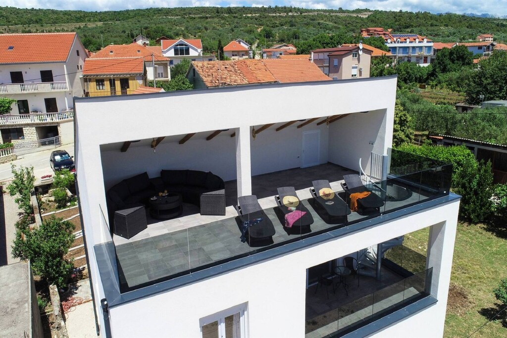 Deze moderne vakantiewoning ligt in het charmante kustplaatsje Posedarje, biedt een prachtig uitzicht op zee en ligt op slechts 200 meter van het dichtstbijzijnde strand. Het is ontworpen voor ontspanning en comfort en is ideaal voor grotere gezinnen of groepen, met plaats voor maximaal 11 gasten in twee ruime appartementen. Het dakterras biedt een adembenemend panoramisch uitzicht op de Adriatische Zee en de omliggende natuur — een perfecte plek om te ontspannen bij zonsondergang of te genieten van een kopje koffie in de ochtend met het geluid van de golven op de achtergrond.