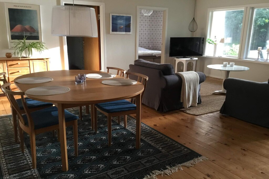 Het huis heeft een open indeling, met een keuken die aansluit op de woonkamer en eetruimte. Grote ramen kijken uit op de gezellige tuin en het kleine pad naar het meer. Er zijn twee slaapkamers, één met een tweepersoonsbed en één met twee eenpersoonsbedden. Er is ook een terras met tuinmeubilair, evenals een kleine barbecueplaats in de tuin. Geniet van uw ontbijt buiten en van de zomerochtenden met uitzicht op het kleine Gårdssjön.