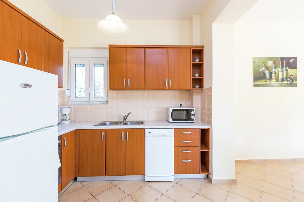 Waterkoker, Broodrooster, Fornuis (elektrisch, 4 kookplaten), Koffiezetapparaat, Magnetron, Afwasmachine, Koel-/vriescombinatie