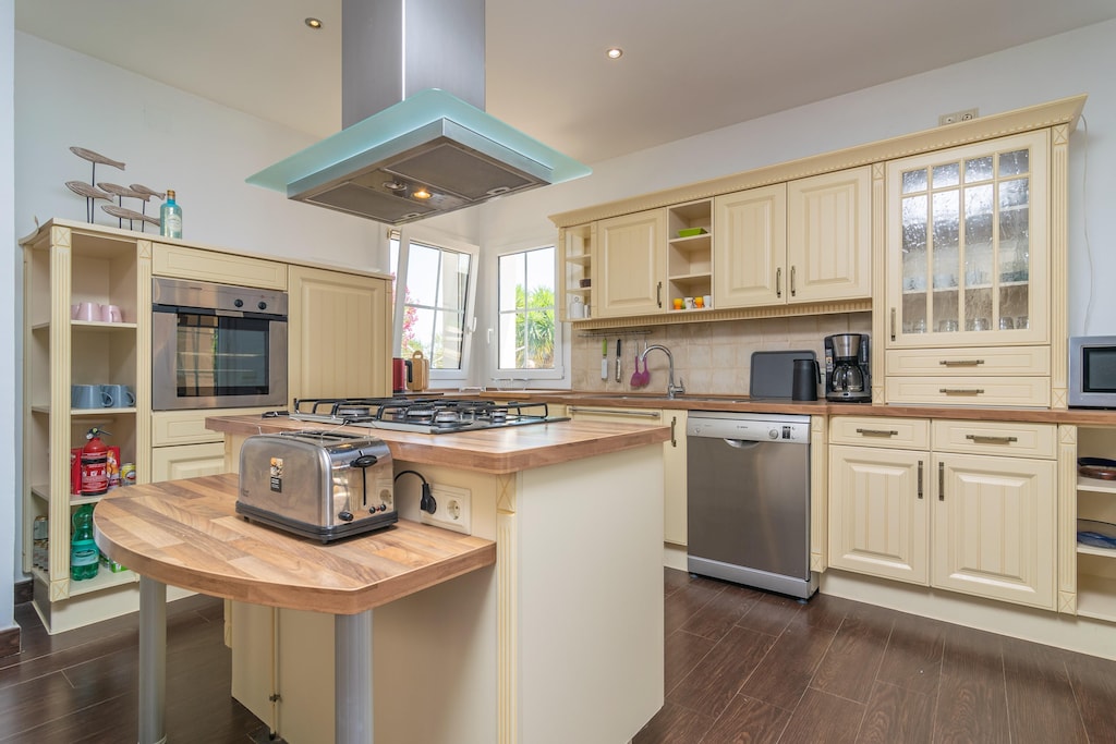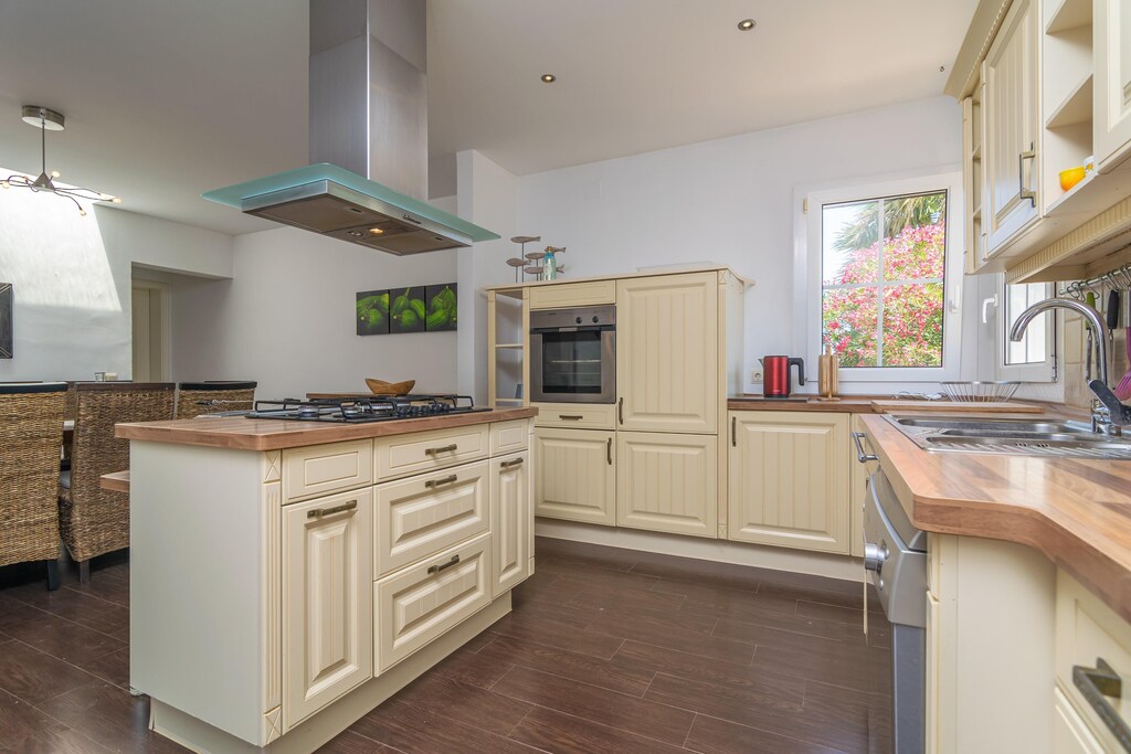 The single-story interior offers a comfortable and welcoming style. In the large living room you can watch Sat-TV. It is connected to the kitchen-dining room through an arch and the kitchen has a gas stove. In the house there are 5 bedrooms, all with double beds except one with 2 single beds. Three of them have an en-suite bathroom with a shower and there is another bathroom with a bathtub and a toilet. The separate laundry room is equipped with a washing machine, iron and ironing board. The equipment is completed by a crib, a high chair and 3 fans.