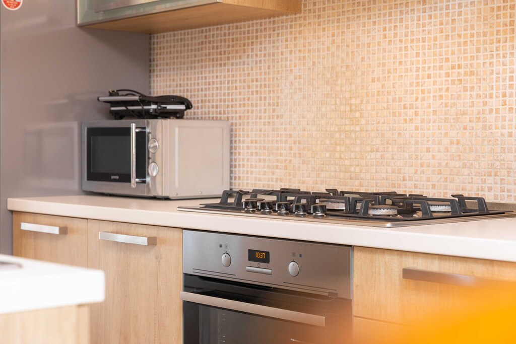 The kitchen is fully equipped with stove, oven, water kettle, toaster, microwave, refrigerator, coffee machine, dish washer and dining area.